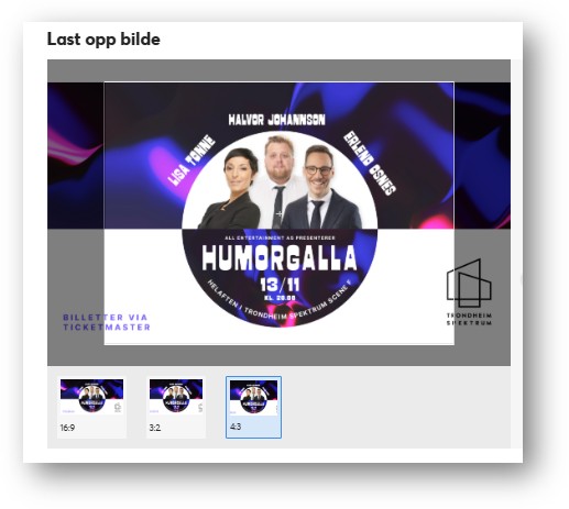 - Bildet vil bli beskåret for å passe til flere kanaler og ulike formater. Sørg for at det aller viktigste er synlig innenfor rammen (4:3) som i dette eksempelet. I tillegg til artistsider og arrangementsider, blir bildet også brukt av for eksempel våre affiliate‑partnere