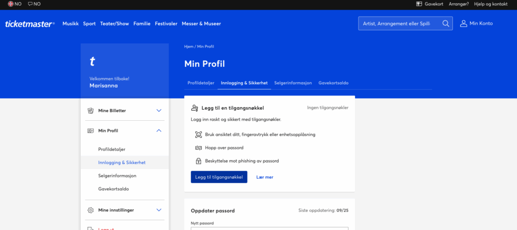 - Neste gang du logger på Ticketmaster-kontoen din, kan du bruke tilgangsnøkkelen i stedet for et passord. Vi anbefaler at du setter opp tilgangsnøkler for flere enheter for å sikre at du kan gjenopprette kontoen din hvis du mister en av enhetene dine.