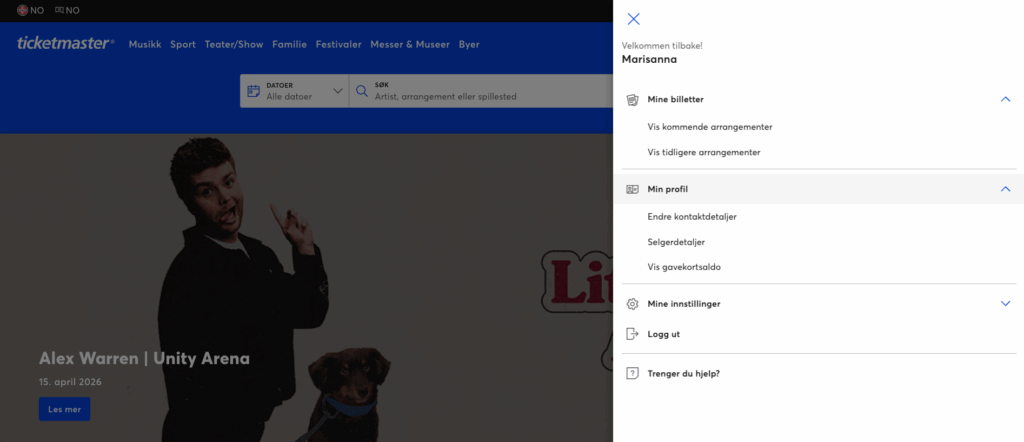 - Logg in på Ticketmaster-kontoen din på mobil eller desktop (ikke Ticketmaster appen), velg «Min konto» og deretter «Endre kontaktdetaljer og deretter & «Innlogging & Sikkerhet».